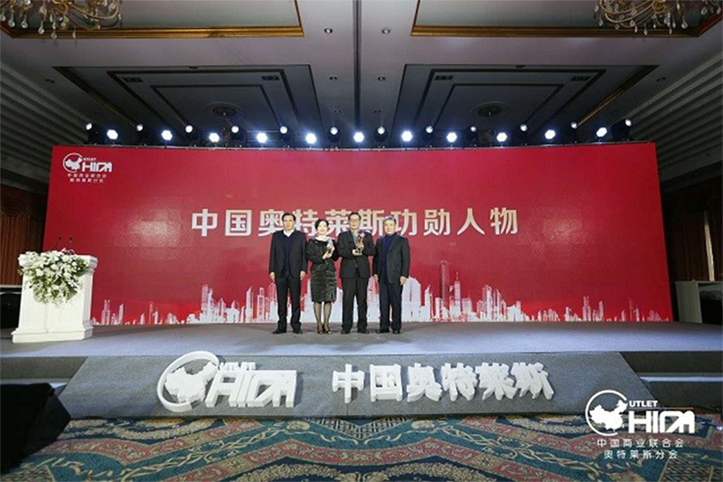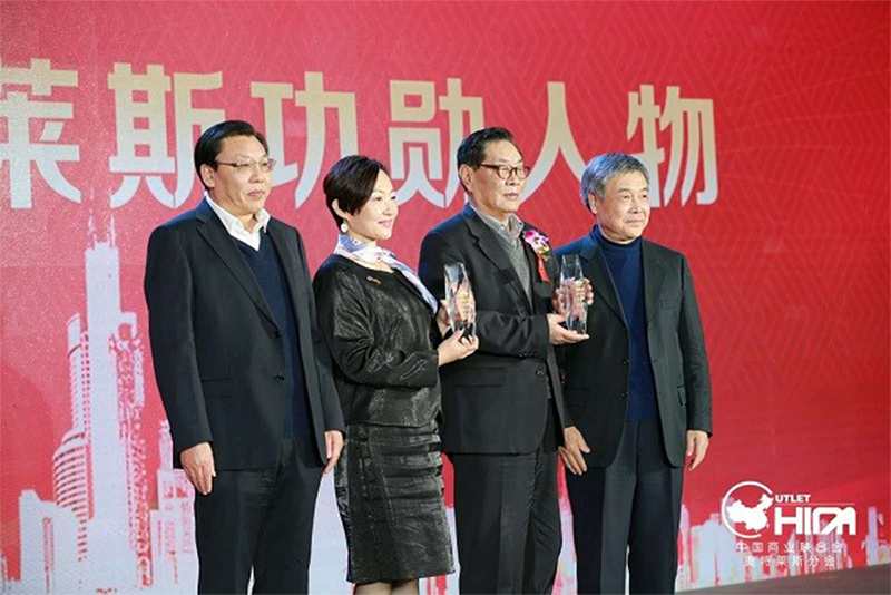 上圖為何濟(jì)海和劉嵐(代萬文英)領(lǐng)取“中國奧特萊斯功勛人物”獎(jiǎng)項(xiàng)