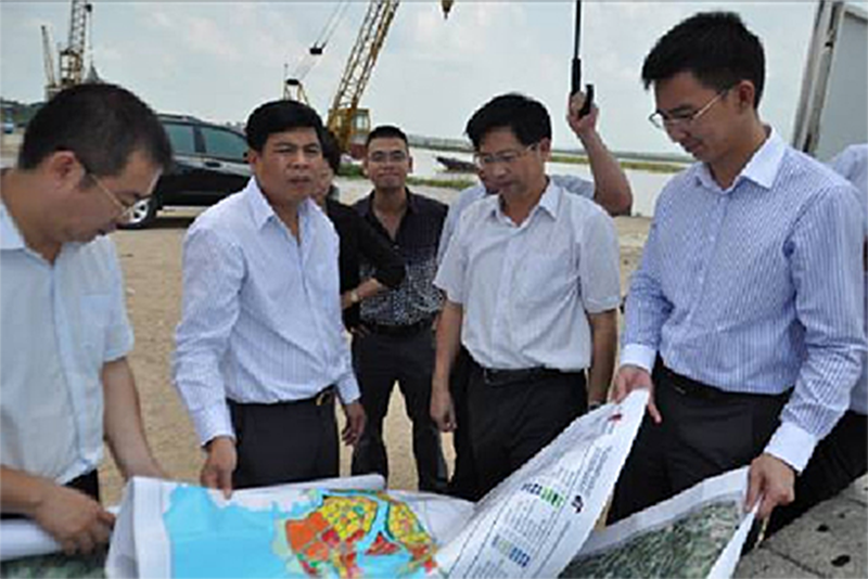 陳春良副主席(左二)與欽州市副市長(zhǎng)陸欽華(右二)進(jìn)行選址探討