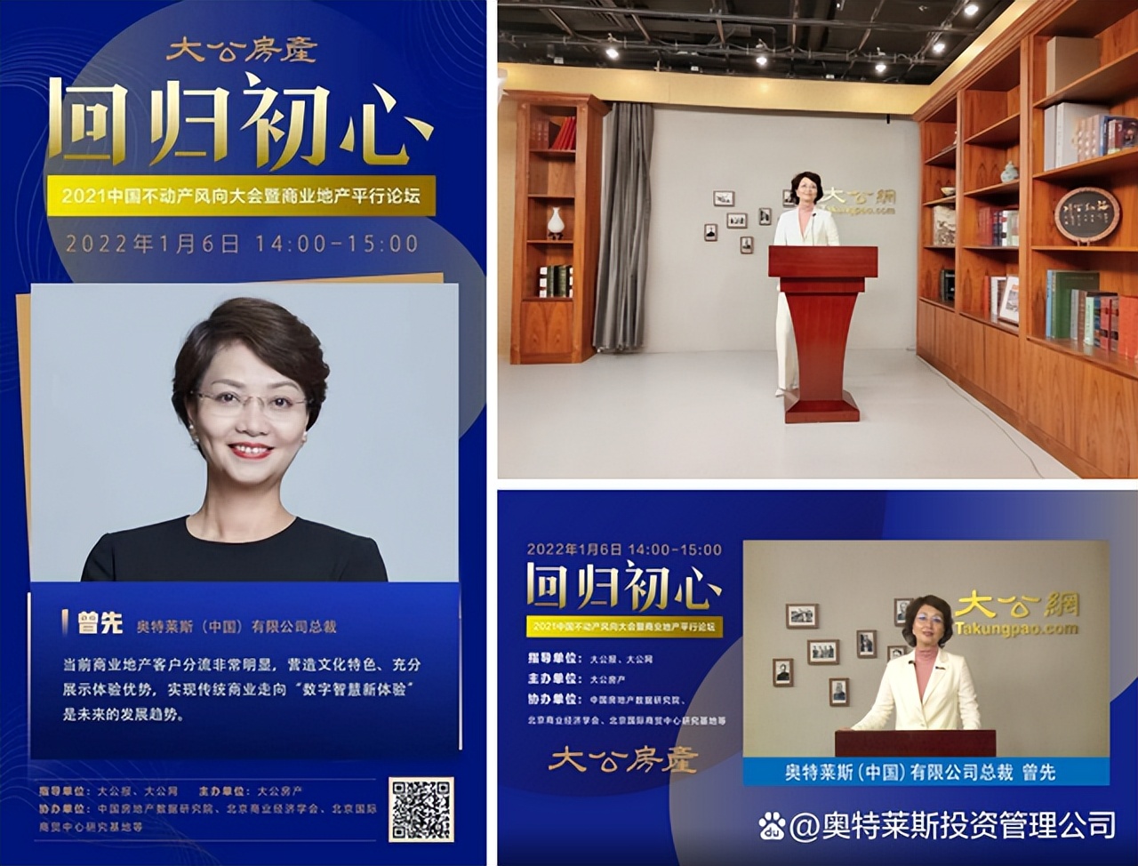 1月6日,由大公網(wǎng)房產(chǎn)頻道聯(lián)合多方機(jī)構(gòu)舉辦的“【回歸初心】——2021中國不動產(chǎn)風(fēng)向大會暨商業(yè)地產(chǎn)平行論壇”線上直播活動正式開始。奧特萊斯(中國)有限公司總裁受邀參加本次活動,并進(jìn)行了精彩的線上直播發(fā)言。