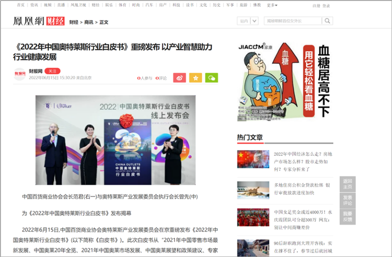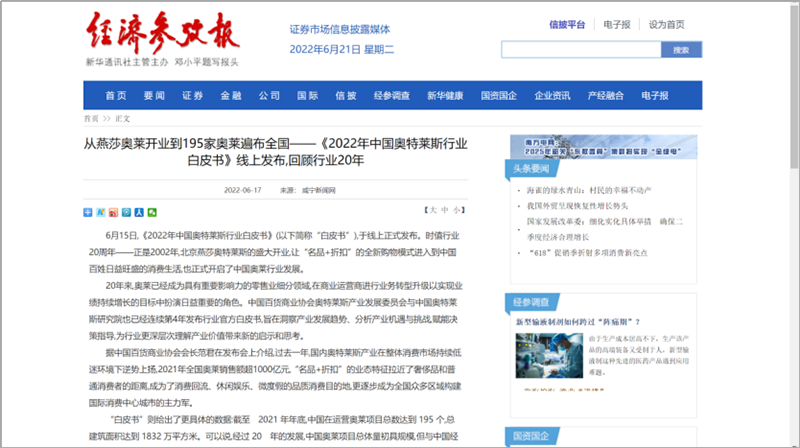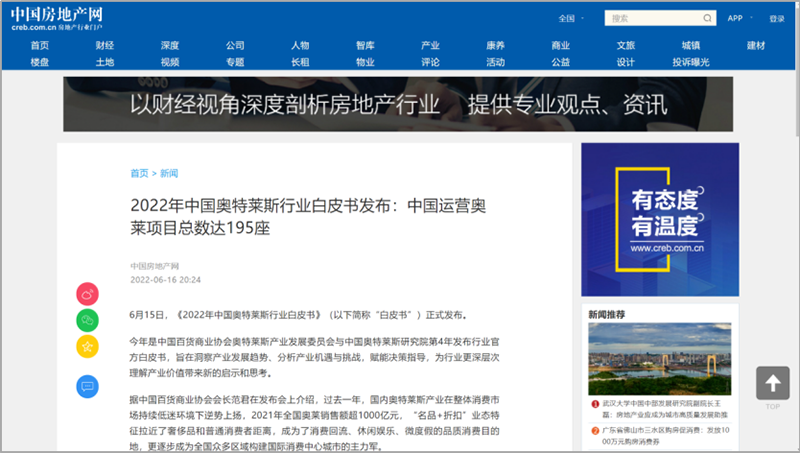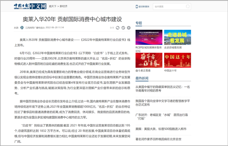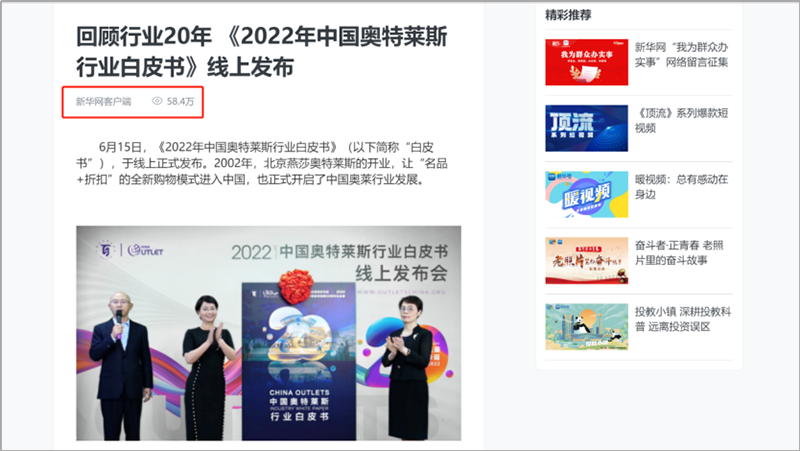 會(huì)后,國(guó)內(nèi)主流權(quán)威媒體紛紛在第一時(shí)間通過各自官方平臺(tái)及渠道發(fā)布此次活動(dòng)盛況及內(nèi)容。截止6月23日,共計(jì)近百家媒體在全網(wǎng)發(fā)布、轉(zhuǎn)載“2022年中國(guó)奧特萊斯行業(yè)白皮書線上發(fā)布”相關(guān)報(bào)道及新聞百余次,全網(wǎng)累積點(diǎn)擊閱讀量近五百萬次。