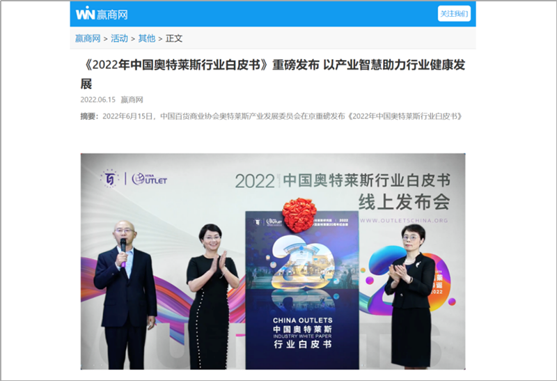 2022年6月15日,中國(guó)百貨商業(yè)協(xié)會(huì)奧特萊斯產(chǎn)業(yè)發(fā)展委員會(huì)線上直播發(fā)布《2022年中國(guó)奧特萊斯行業(yè)白皮書》。白皮書中“2021年中國(guó)零售市場(chǎng)最新發(fā)展、中國(guó)奧萊20年全覽、2021年中國(guó)奧萊市場(chǎng)發(fā)展、中國(guó)奧萊展望和政策建議、專家訪談”等內(nèi)容吸引政府領(lǐng)導(dǎo)、專業(yè)機(jī)構(gòu)、產(chǎn)業(yè)運(yùn)營(yíng)商、品牌商、服務(wù)商、媒體記者及眾多奧萊消費(fèi)者共計(jì)20余萬人參會(huì),成為國(guó)內(nèi)奧萊行業(yè)年度一大焦點(diǎn)。
