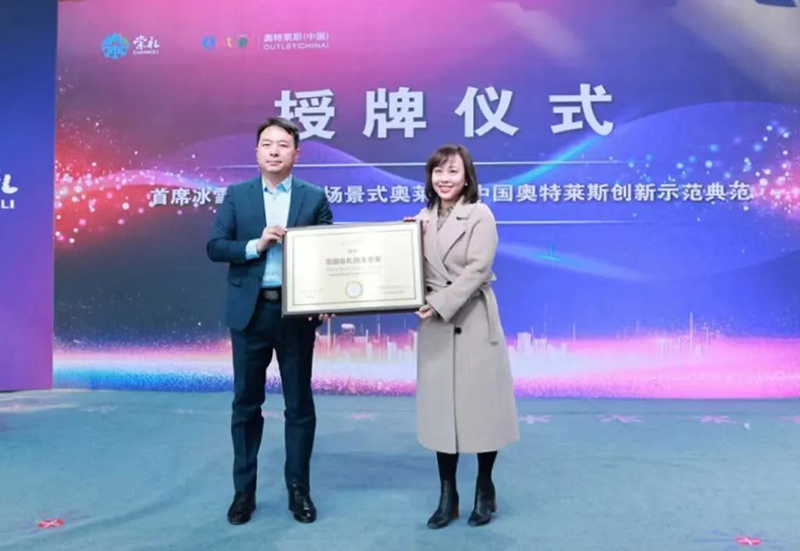 授牌儀式(圖左:中房智庫秘書長鄧明政;圖右:奧特萊斯(中國)品牌管理中心總經(jīng)理愛新覺羅·啟萱)
