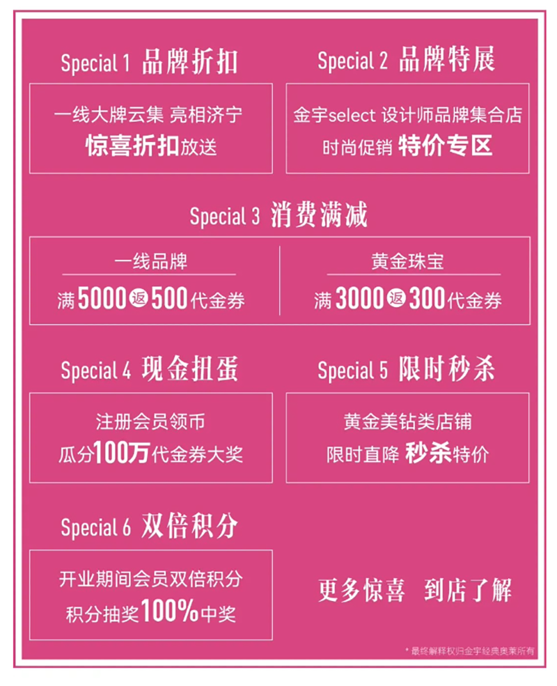 隨著金宇經(jīng)典奧萊的開業(yè),濟(jì)寧國際生活節(jié)正式拉開序幕。以回饋濟(jì)寧人為目的,制造濟(jì)寧人自己的時(shí)尚地盤,4.29-5.30盛惠不止狂歡不停,覆蓋五一黃金周,推出大量優(yōu)惠活動,時(shí)尚秀場、live演出、驚喜折扣、雙倍積分、現(xiàn)金扭蛋等,回饋廣大市民朋友!