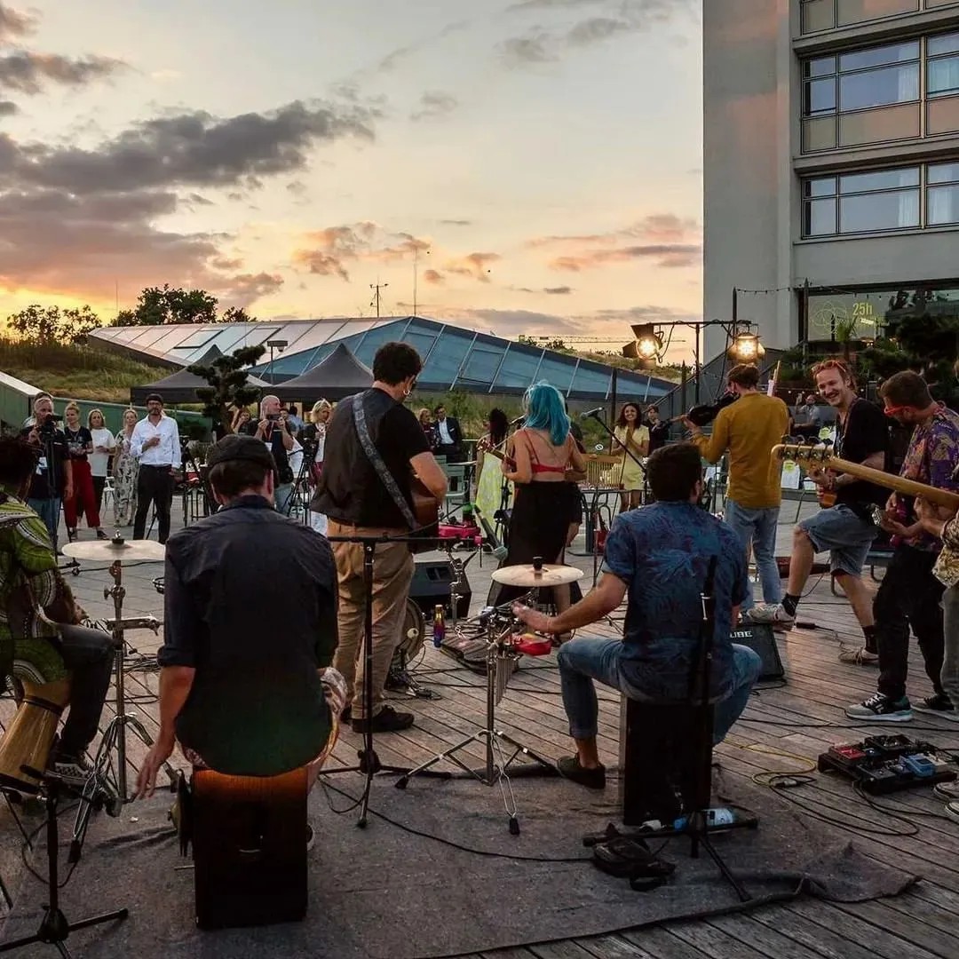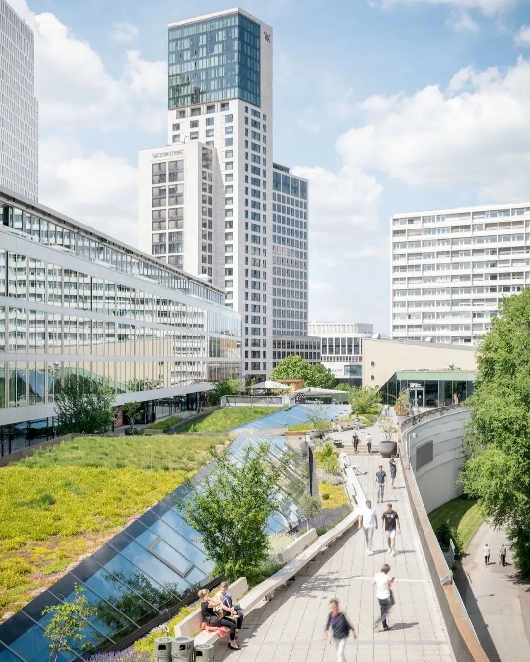 在商業(yè)的二層則設(shè)置了一個開放、通透的公共空間,同柏林潮流酒店25小時(Twenty five hours hotel)進行聯(lián)通。并以城市綠洲為設(shè)計概念,在頂層設(shè)計了一個布滿植物盆栽的七千平方公尺的天臺,供給顧客休憩社交,營造自由、無拘束的商業(yè)氛圍,與項目的整體定位相得益彰。