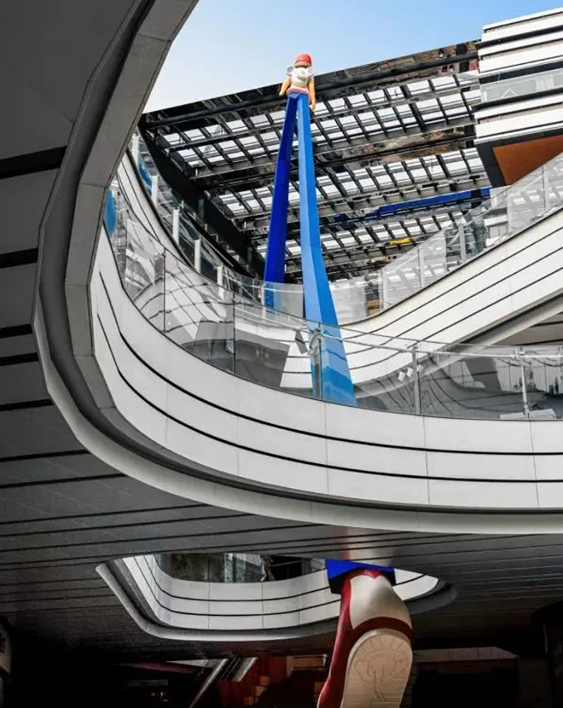 最引人注目的是由創(chuàng)意品牌AllRightsReserved,連同藝術(shù)團體Inges Idee打造的大型戶外永久藝術(shù)裝置——“邁上!”,這件裝置分別位于東里中庭和西里中庭,縱橫跨越兩層商業(yè)空間。“邁上!”是一位背著大象背包的小男孩,他接收到來自大象的神奇力量,邁出步伐,一步跨上了兩層樓。