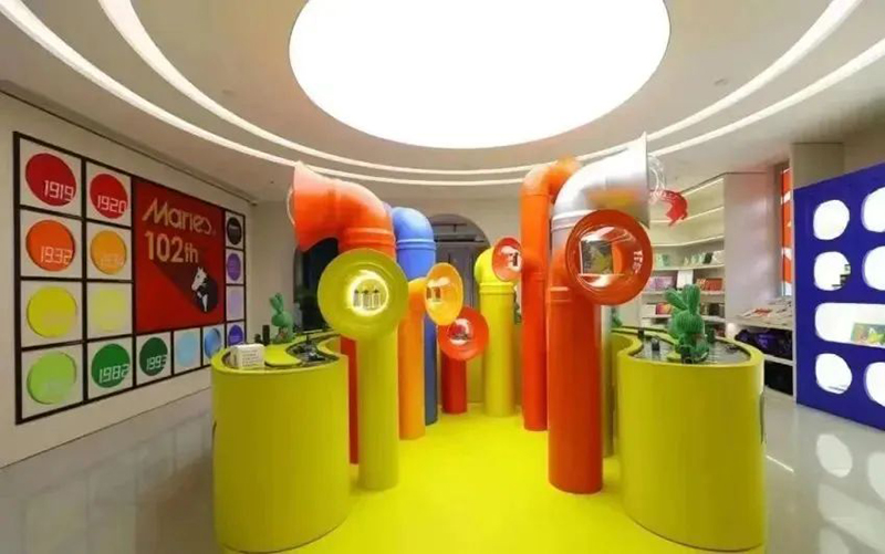 Mamǎfufú將“小紅閑”這一概念發(fā)揮得淋漓盡致,無論是整體的場景風格,對于色彩的靈活運用,還是互動體驗的內(nèi)容和品牌首店引入,都創(chuàng)造了極高的出片效果,吸引眾多年輕人前來打卡消費。Mamǎfufú超級百貨是一個跨界聯(lián)合的潮流文創(chuàng)空間,占據(jù)了M+馬利位置最好的沿街二樓,無論室外的墻體,還是室內(nèi)的布置,均大面積運用了極具張力的紅黃藍三原色,將“馬利”這個百年顏料品牌的“色彩主義”貫穿于整體空間設(shè)計中。1000㎡的空間內(nèi)營造了8個主題區(qū)域,設(shè)置馬利趣味工廠、馬利畫材、POP-UP Market、色彩理想國、靈感書集、色彩生活集市、色彩沙龍等主題區(qū)域,涵蓋藝術(shù)展覽、手工工作室、畫材、圖書、生活家居、藝術(shù)衍生、服裝零售等多種業(yè)態(tài)內(nèi)容。
