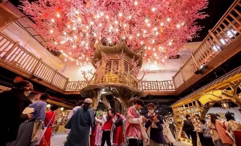 位于北京東三環(huán)富力廣場5層的大型沉浸式主題商業(yè)空間“戲精桃花源”,占地面積400多平方米,以桃花源為場景主題,在室內(nèi)打造了一個沉浸式娛樂休閑空間,將沉浸式場景、劇情演員、故事游戲、入駐店鋪,通過游戲串聯(lián)起來,消費(fèi)者可以在真人NPC的互動和幫助下完成任務(wù),在游逛的同時還完成了游戲體驗(yàn)。