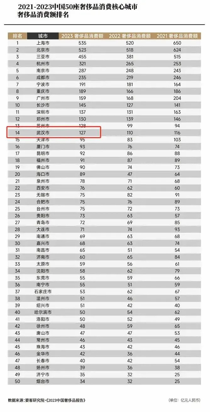 盡管SKP入駐武漢雄心勃勃,但仍面臨諸多挑戰(zhàn)。首要任務(wù)是深度挖掘武漢本地的奢侈品消費(fèi)潛力,盡管這座城市對(duì)新興事物展現(xiàn)出高度興趣,但奢侈品消費(fèi)文化的培育尚需時(shí)日。據(jù)要客研究院《2023中國(guó)奢侈品報(bào)告》揭示,武漢在奢侈品消費(fèi)領(lǐng)域的表現(xiàn)尚屬中游,2021至2023年間消費(fèi)額位列全國(guó)第14,2023年具體消費(fèi)額達(dá)127億元,這一成績(jī)不及華中區(qū)域內(nèi)的鄭州,亦落后于同級(jí)別的新一線(xiàn)城市成都與長(zhǎng)沙,彰顯了SKP在武漢市場(chǎng)擴(kuò)展的艱巨性與必要性。
