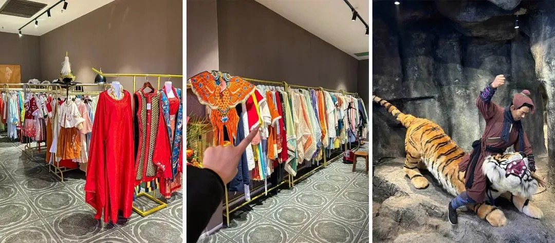 宋朝食間的另一大亮點(diǎn)是漢服體驗(yàn)館(需付費(fèi))。除了提供宋朝傳統(tǒng)的男子常服襕衫、女子襦裙款式,也有不少經(jīng)過(guò)改良的“新中式”款式。換上古裝后,可以到多個(gè)拍照點(diǎn)位打卡,如武松打虎、魯提轄倒拔垂柳等經(jīng)典場(chǎng)景,還可以到大舞臺(tái),看各式文藝表演。