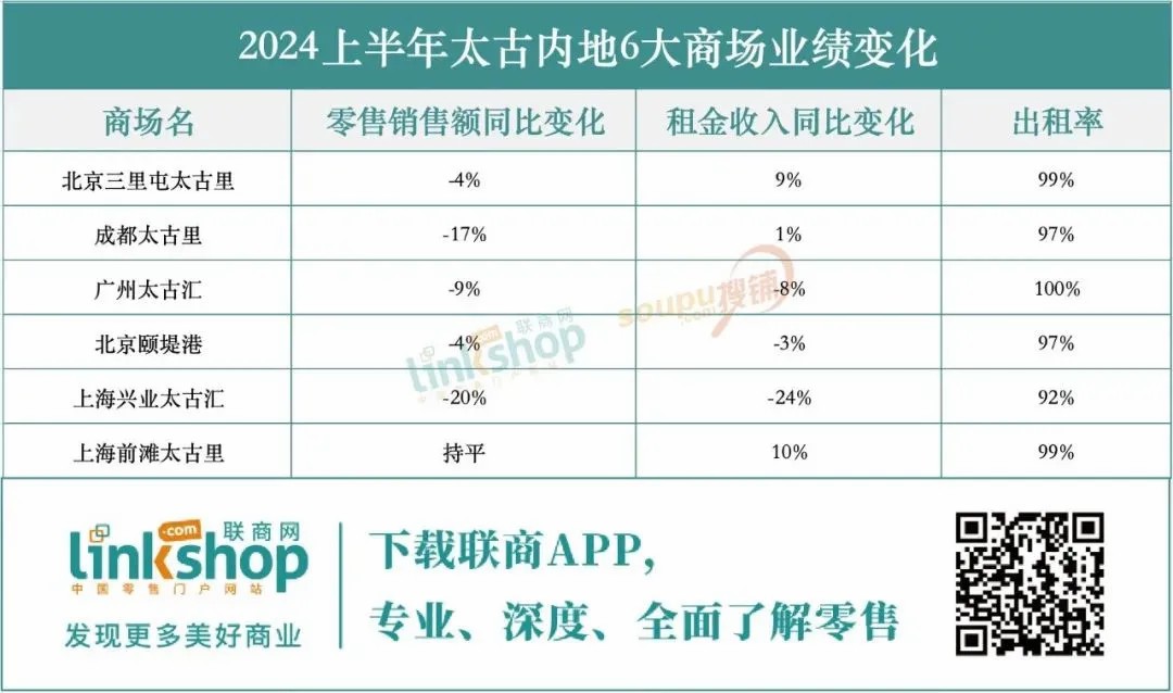 在租金收入層面,廣州太古匯、北京頤堤港及上海興業(yè)太古匯這三大商場(chǎng)在上半年遭遇了挑戰(zhàn),其租金收入分別出現(xiàn)了8%、3%及24%的同比下滑,而其余商場(chǎng)則實(shí)現(xiàn)了正增長(zhǎng)。這一趨勢(shì)與恒隆集團(tuán)的財(cái)報(bào)相呼應(yīng),共同揭示了今年上半年國(guó)內(nèi)奢侈品消費(fèi)市場(chǎng)的疲軟態(tài)勢(shì)。