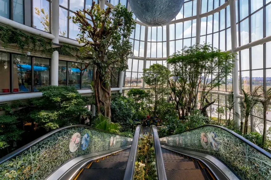 以“一日微度假勝地”為定位的上海南翔印象城MEGA,不僅融合了多元業(yè)態(tài),還巧妙地融入了植物園等自然生態(tài)元素。在建筑設(shè)計上,其外立面以“梯田山丘”為靈感,打造出上海罕見的退臺花園;在商場內(nèi)部,創(chuàng)造性地引入了森林、濕地等自然景觀,構(gòu)筑了一座占地約600平方米、高達(dá)5層、擁有200多種國內(nèi)外植物的跨層生態(tài)植物園。