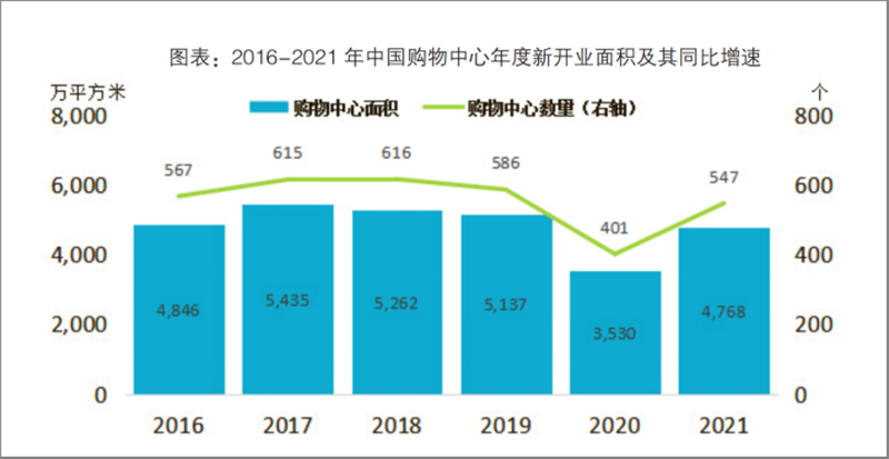 《白皮書》在“2021年中國零售市場最新發(fā)展”部分指出,2021年,中國實現(xiàn)GDP(國內(nèi)生產(chǎn)總值)114.4萬億元,穩(wěn)居全球第二大經(jīng)濟(jì)體,全年社會消費(fèi)品零售總額達(dá)到44.1萬億元,同比增長12.5%。同時,中國在運(yùn)營購物中心數(shù)量達(dá)到6387個,總面積達(dá)到4.75億平方米。其中,2021年新開業(yè)購物中心數(shù)量為547個,總面積為4768萬平方米。中國“購物中心年新開業(yè)面積/在運(yùn)營面積”比例持續(xù)下降,2021年年末降至0.1。中國已經(jīng)進(jìn)入購物中心存量時代。